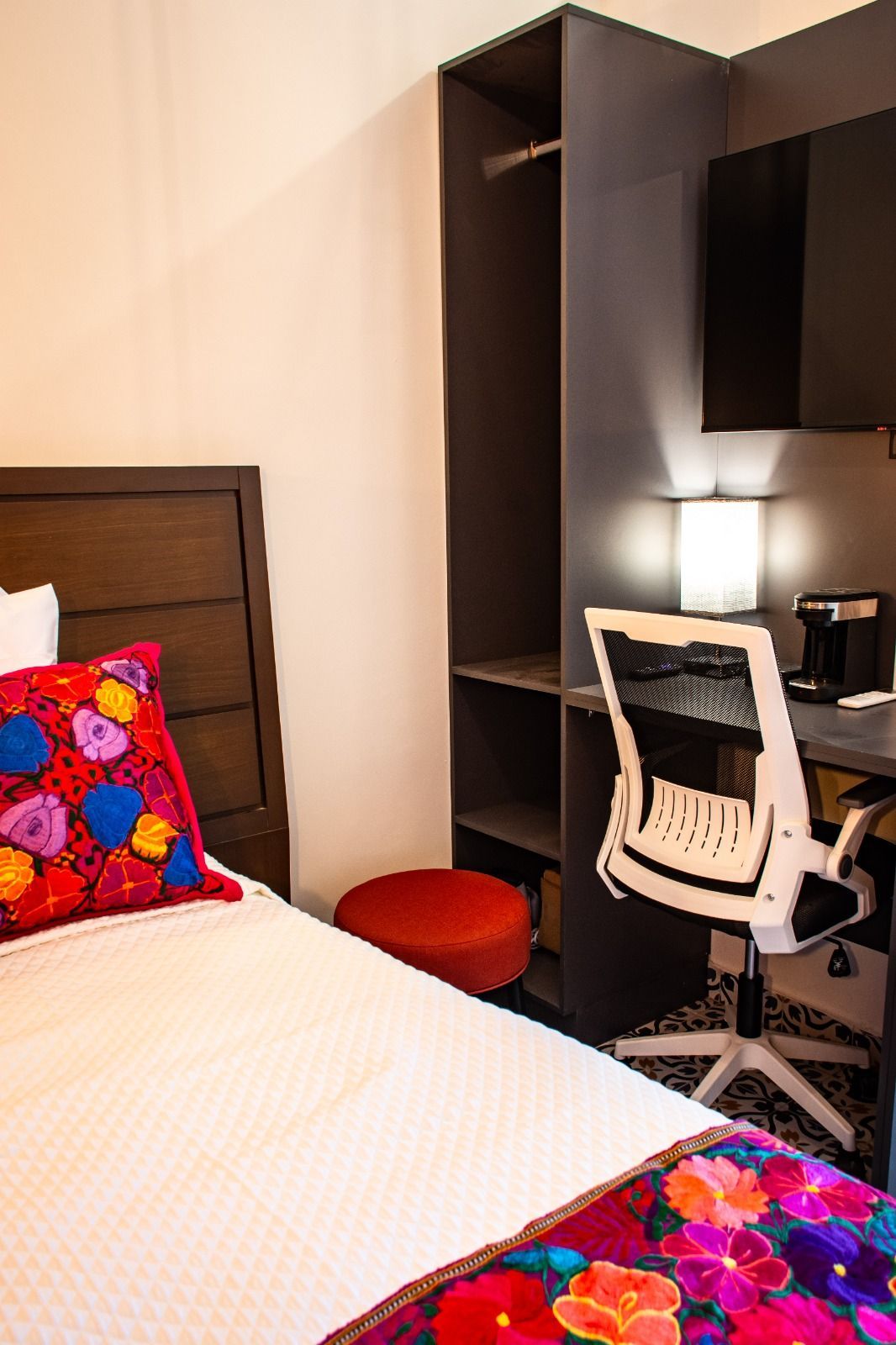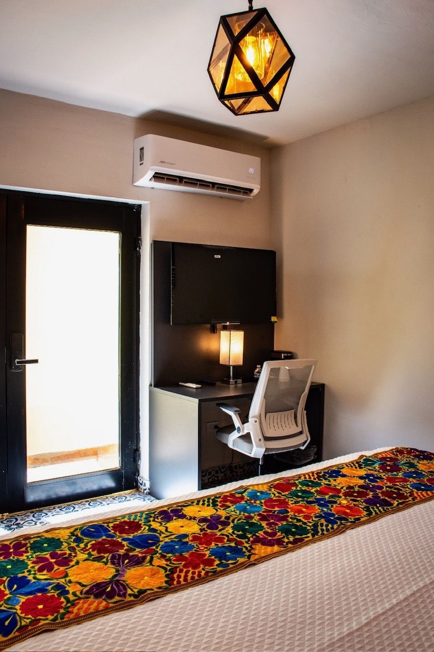 La habitación cuenta con una cama King Size. Decoración moderna y detalles de madera. Cuenta con aire acondicionado, cafetera, escritorio y baño privado. Ideal para descansar y disfrutar de Monterrey con comodidad